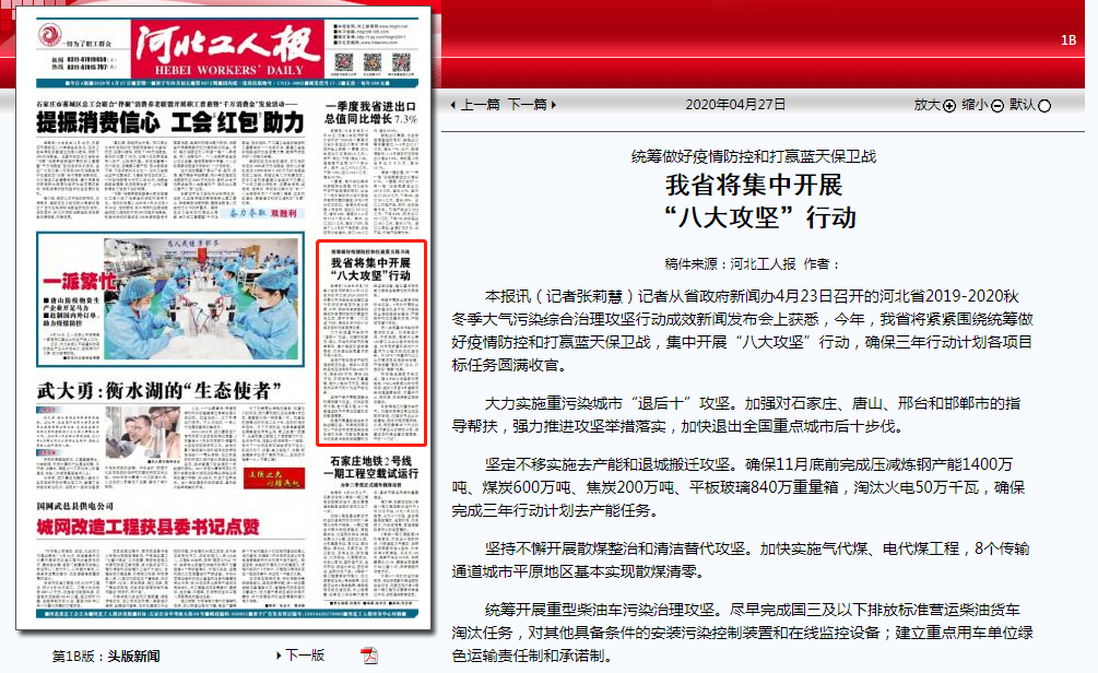 本报讯(记者张莉慧)记者从省政府新闻办4月23日召开的河北省2019-2020秋冬季大气污染综合治理攻坚行动成效新闻发布会上获悉,今年,我省将紧紧围绕统筹做好疫情防控和打赢蓝天保卫战,集中开展“八大攻坚”行动,确保三年行动计划各项目标任务圆满收官。