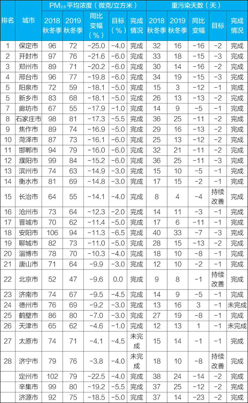 通报称,2019年10月—2020年3月,京津冀及周边地区“2+26”城市的PM2.5平均浓度为70微克/立方米,同比下降13.6%;发生重污染395天次,同比下降36.2%,超额完成PM2.5平均浓度同比下降4%、重污染天数同比减少6%的改善目标。
