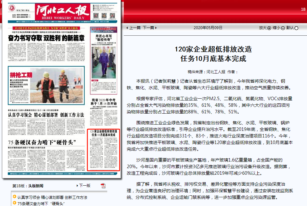 沙河是国内重要的平板玻璃生产基地,年产玻璃1.6亿重量箱,占全国产能的20%。今年以来,沙河市累计投资3亿多元推进玻璃行业治污设备升级改造。据测算,改造工程完成后,沙河玻璃行业总体排放量较2019年可减少60%以上。