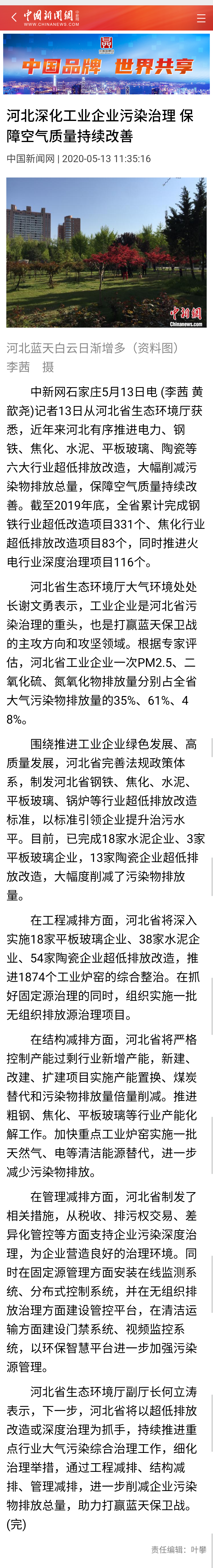 中国新闻网 :河北深化工业企业污染治理 保障空气质量持续改善