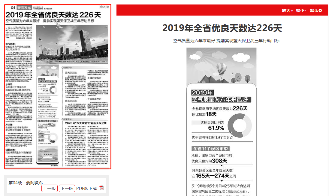 2019年,空气质量为六年来最好,全省设区市平均优良天数为226天,同比增加18天,达标天数比例为61.9%,优于省考核目标1.9个百分点。全省11个设区市中,承德、张家口两个设区市的优良天数均为308天,其余各设区市全年优良天数在165天—274天之间。5—9月连续5个月PM2.5平均浓度达到国家空气质量二级标准(35微克/立方米),为有监测记录以来历史最好水平;秋冬季(10月1日至12月31日)PM2.5平均浓度55微克/立方米,同比下降16.7%。