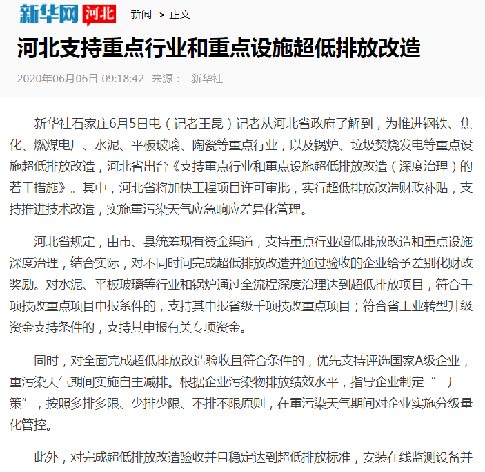新华社石家庄6月5日电(记者王昆)记者从河北省政府了解到,为推进钢铁、焦化、燃煤电厂、水泥、平板玻璃、陶瓷等重点行业,以及锅炉、垃圾焚烧发电等重点设施超低排放改造,河北省出台《支持重点行业和重点设施超低排放改造(深度治理)的若干措施》。其中,河北省将加快工程项目许可审批,实行超低排放改造财政补贴,支持推进技术改造,实施重污染天气应急响应差异化管理。