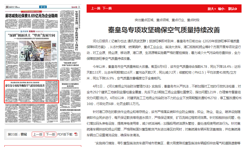 河北日报讯(记者孙也达 通讯员武艺群)旅游旺季即将到来,秦皇岛市日前出台《2020年旅游旺季环境质量保障8项方案》,从农村散煤、燃煤锅炉、重点工业企业、柴油大货车、港口船舶和扬尘等8个方面开展专项攻坚行动,对工业源、扬尘源、移动源、港口源、生活源等实施最严格的管控措施,着力减少大气污染物总量排放,全力保障旅游旺季空气质量持续改善。