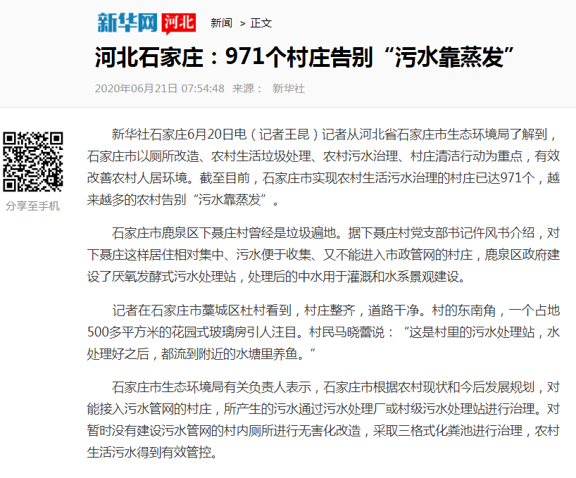 石家庄市91直播局有关负责人表示,石家庄市根据农村现状和今后发展规划,对能接入污水管网的村庄,所产生的污水通过污水处理厂或村级污水处理站进行治理。对暂时没有建设污水管网的村内厕所进行无害化改造,采取三格式化粪池进行治理,农村生活污水得到有效管控。