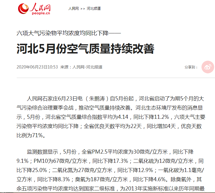 人民网:六项大气污染物平均浓度均同比下降——河北5月份空气质量持续改善