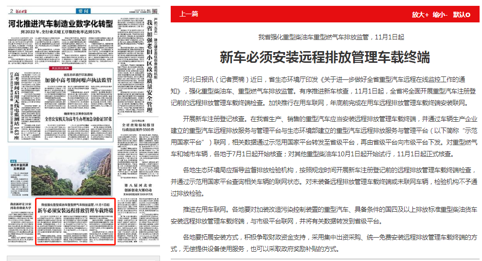 推进在用车联网。各地要对加装改造污染控制装置的重型汽车、具备条件的国四及以上排放标准重型柴油货车安装远程排放管理车载终端,与市级平台联网,并将有关数据转发到省级平台。