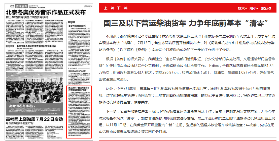 本报讯(燕都融媒体记者呼延世聪)我省将加快推进国三及以下排放标准营运柴油货车淘汰工作,力争今年底实现基本淘汰“清零”。7月13日,省91直播厅召开新闻发布会,对《河北省机动车和非道路移动机械排放污染防治条例》(以下简称《条例》)实施两个月取得的成效和下一步的工作进行了介绍。
