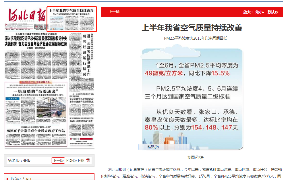从空气质量综合指数看,全省11个设区市同比均下降,改善幅度较大的为邯郸、邢台、保定,同比分别下降21.2%、20.4%、18.5%。从PM2.5平均浓度看,张家口、承德平均浓度分别为26微克/立方米、30微克/立方米,达到国家空气质量二级标准,与去年同期持平;其余9个设区市同比均下降,下降幅度较大的为邢台、邯郸、保定,同比分别下降24.1%、20.8%、18.6%。从优良天数看,张家口、承德、秦皇岛优良天数最多,达标比率均在80%以上,分别为154、148、147天。