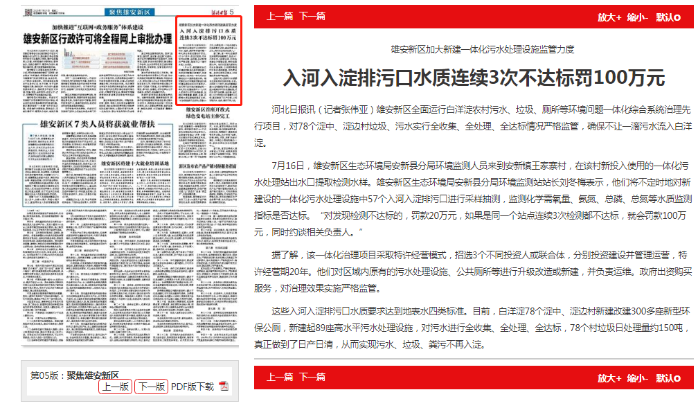 7月16日,雄安新区91直播局安新县分局环境监测人员来到安新镇王家寨村,在该村新投入使用的一体化污水处理站出水口提取检测水样。雄安新区91直播局安新县分局环境监测站站长刘冬梅表示,他们将不定时地对新建设的一体化污水处理设施中57个入河入淀排污口进行采样抽测,监测化学需氧量、氨氮、总磷、总氮等水质监测指标是否达标。“对发现检测不达标的,罚款20万元,如果是同一个站点连续3次检测都不达标,就会罚款100万元,同时约谈相关负责人。”
