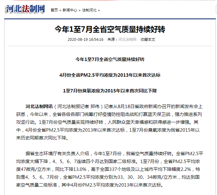 (河北法制报记者 郑伟)记者从8月18日省政府新闻办召开的新闻发布会上获悉,今年以来,全省各级各部门统筹打好疫情防控阻击战和打赢蓝天保卫战,强力推进系列攻坚行动。1至7月份空气质量实现持续好转,人民群众蓝天幸福感和获得感进一步增强。其中,4月份全省PM2.5平均浓度为2013年以来首次达标,1至7月份臭氧浓度为我省2015年以来历史同期首次同比下降。