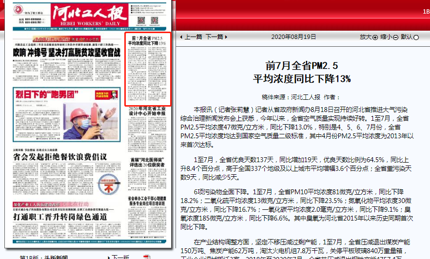 6项污染物全面下降。1至7月,全省PM10平均浓度81微克/立方米,同比下降18.2%;二氧化硫平均浓度13微克/立方米,同比下降23.5%;氮氧化物平均浓度30微克/立方米,同比下降16.7%;一氧化碳平均浓度2.0毫克/立方米,同比下降9.1%;臭氧浓度185微克/立方米,同比下降6.6%。其中臭氧为河北省2015年以来历史同期首次同比下降。
