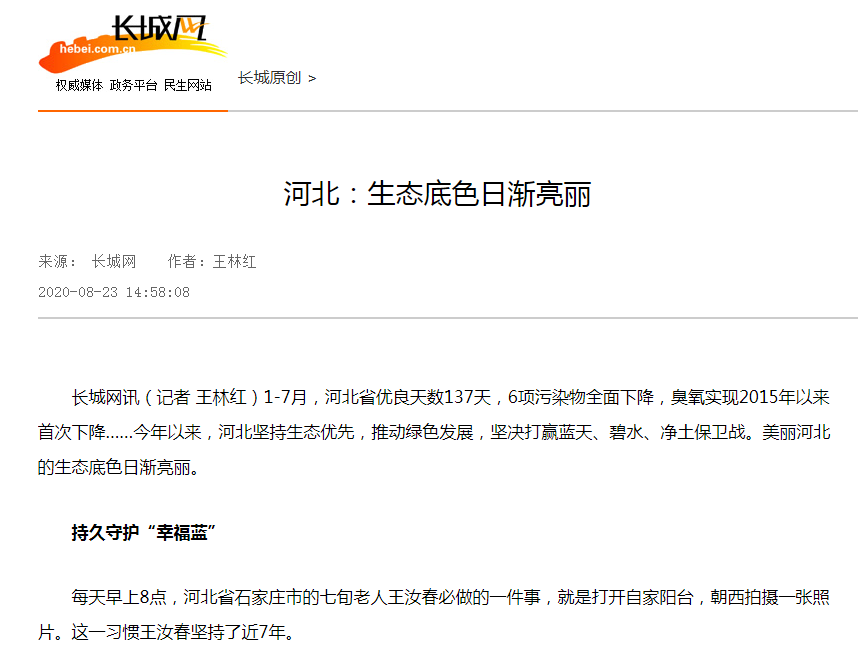 2020年1-7月,河北省PM2.5平均浓度47微克/立方米,同比下降13.0%,特别是4、5、6、7月份,河北省PM2.5平均浓度分别为33、30、30、34微克/立方米,均达到国家空气质量二级标准。其中,4月份PM2.5平均浓度为2013年以来首次达标。优良天数137天,同比增加19天。