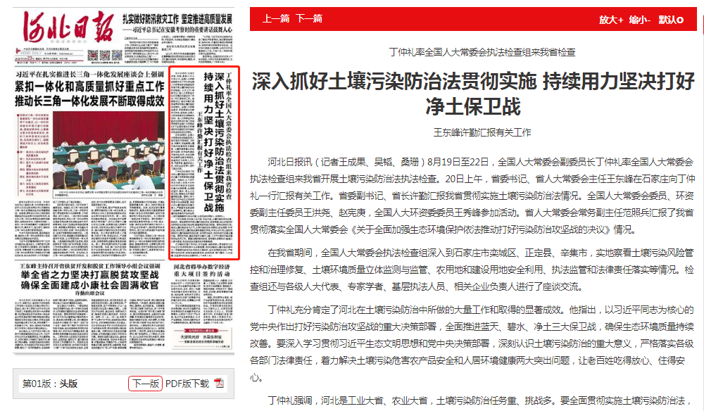 在我省期间,全国人大常委会执法检查组深入到石家庄市栾城区、正定县、辛集市,实地察看土壤污染风险管控和治理修复、土壤环境质量立体监测与监管、农用地和建设用地安全利用、执法监管和法律责任落实等情况。检查组还与各级人大代表、专家学者、基层执法人员、相关企业负责人进行了座谈交流。