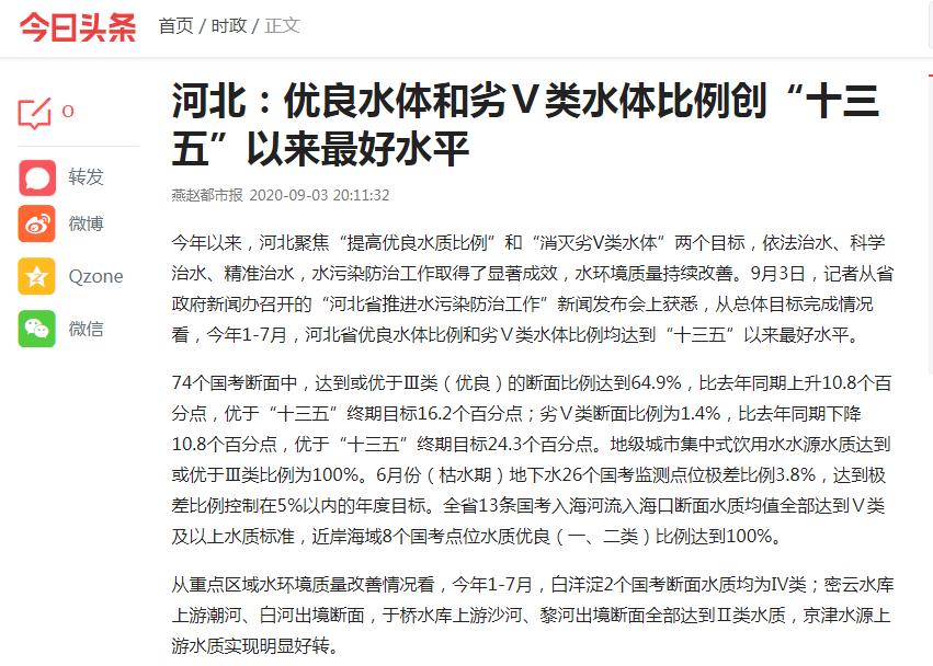 今年以来,河北聚焦“提高优良水质比例”和“消灭劣V类水体”两个目标,依法治水、科学治水、精准治水,水污染防治工作取得了显著成效,水环境质量持续改善。9月3日,记者从省政府新闻办召开的“河北省推进水污染防治工作”新闻发布会上获悉,从总体目标完成情况看,今年1-7月,河北省优良水体比例和劣Ⅴ类水体比例均达到“十三五”以来最好水平。