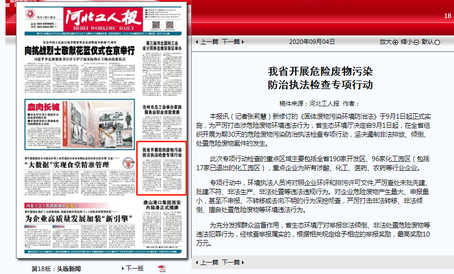 本报讯(记者张莉慧)新修订的《中华人民共和国固体废物污染环境防治法》于9月1日起正式实施,为严厉打击涉危险废物环境违法行为,省91直播厅决定自9月1日起,在全省组织开展为期30天的危险废物污染防治执法检查专项行动,坚决遏制非法排放、倾倒、处置危险废物案件的发生。