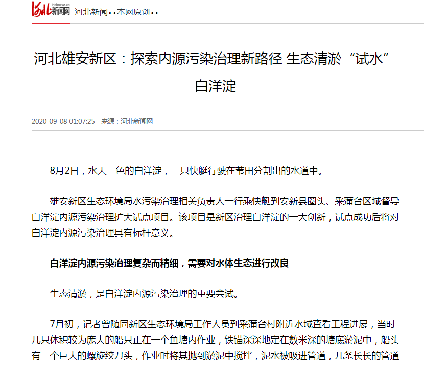 2019年,雄安新区在多次论证基础上,选择在安新县采蒲台村和南刘庄村2个代表性区域开展底泥内源污染治理试点(一期)。此后,新区委托中科院91直播研究中心开展了专题研究,并组织编制《2020年白洋淀内源污染治理扩大试点实施方案》,根本任务是协同推进内源污染治理、生态本底修复和水动力改善,从而全面完成白洋淀规划中关于生态清淤试点要求。