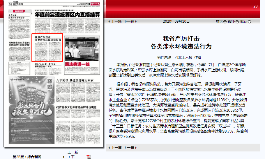 据介绍,我省坚持源头防范,着力开展污染综合治理。督促指导大清河、子牙河、黑龙港及运东等重点流域省级以上工业园区加快实施污水集中处理设施提标改造;开展“碧水2020”环境执法专项行动,严厉打击各类涉水环境违法行为,检查涉水工业企业(点位)7238家次,发现并督促整改各类涉水环境问题1103个。开展城镇污水处理和黑臭水体治理。大清河等重点流域内市、县完成45座污水处理厂提标改造任务。省住建厅集中推进城市排水管网雨污分流改造,完成雨污分流改造1058公里。全省排查出的48条城市黑臭水体全部完成整治,消除比例100%,提前完成了国家确定的目标任务。累计完成12726个村庄的农村环境综合整治,提前完成了国家下达我省“十三五”目标任务;农村生活污水治理和卫生厕所改造任务实现“双过半”。积极提升畜禽粪污资源化利用水平,全省畜禽粪污处理设施装备配套率达到98.7%,综合利用率达到76.9%。