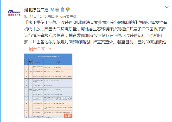 河北综合广播微博:未正常使用油气回收装置 河北依法立案处罚39家问题加油站