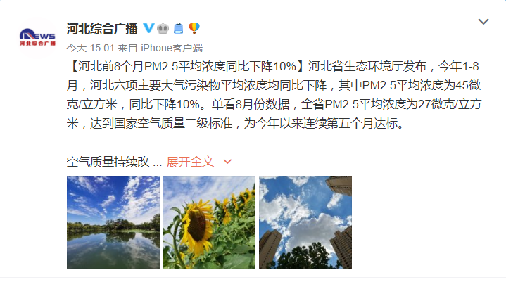 河北综合广播微博:河北前8个月PM2.5平均浓度同比下降10%
