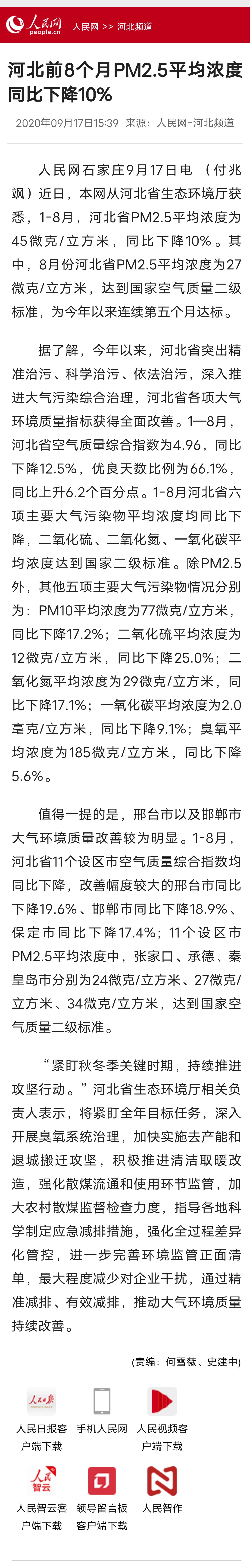 人民网:河北前8个月PM2.5平均浓度同比下降10%