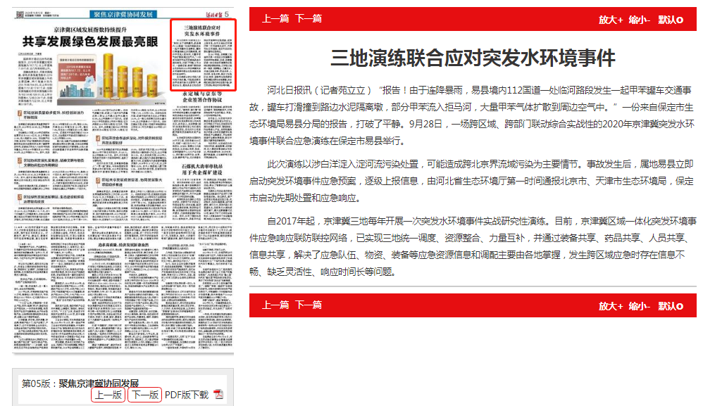 自2017年起,京津冀三地每年开展一次突发水环境事件实战研究性演练。目前,京津冀区域一体化突发环境事件应急响应联防联控网络,已实现三地统一调度、资源整合、力量互补,并通过装备共享、药品共享、人员共享、信息共享,解决了应急队伍、物资、装备等应急资源信息和调配主要由各地掌握,发生跨区域应急时存在信息不畅、缺乏灵活性、响应时间长等问题。