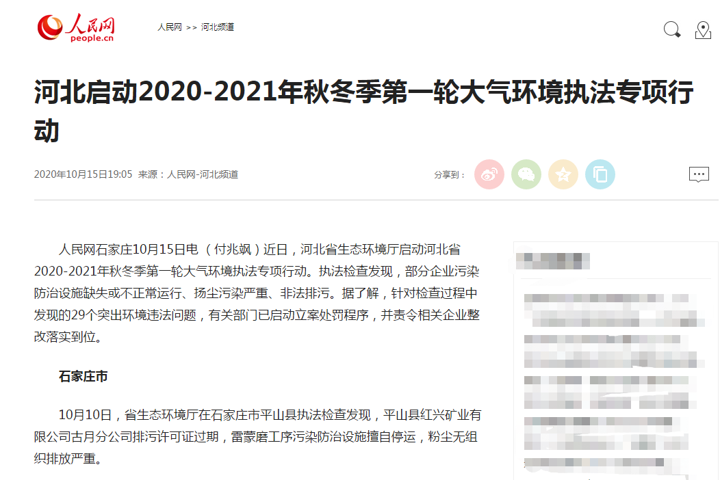 人民网:河北启动2020-2021年秋冬季第一轮大气环境执法专项行动