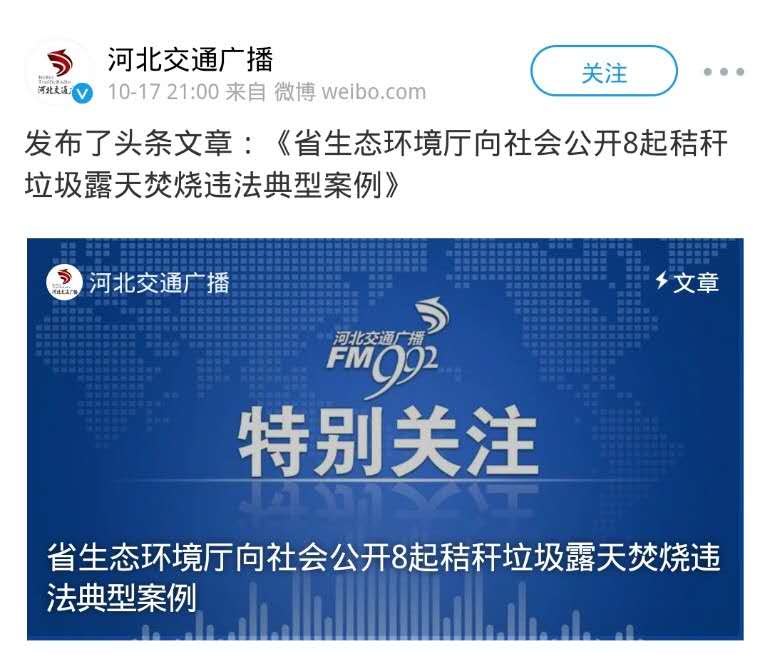 河北交通广播微博:省91直播厅向社会公开8起秸秆垃圾露天焚烧违法典型案例