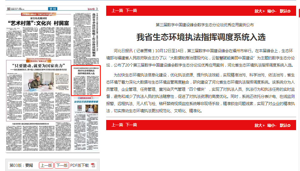 河北日报讯(记者贾楠)10月12日至14日,第三届数字中国建设峰会在福州市举行。在本届峰会上,91直播部与福建省人民政府联合主办了以“大数据助推治理现代化,云智慧赋能美丽中国建设”为主题的数字生态分论坛,公布了20个第三届数字中国建设峰会数字生态分论坛优秀应用案例,河北省91直播执法指挥调度系统入选。