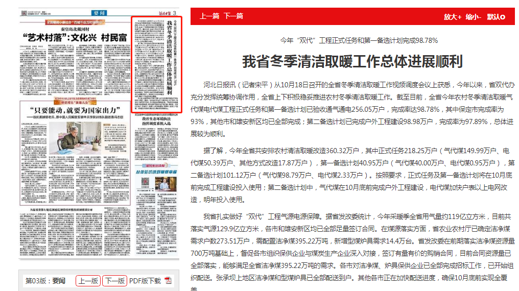河北日报讯(记者宋平)从10月18日召开的全省冬季清洁取暖工作视频调度会议上获悉,今年以来,省双代办充分发挥统筹协调作用,全省上下积极稳妥推进农村冬季清洁取暖工作。截至目前,全省今年农村冬季清洁取暖气代煤电代煤工程正式任务和第一备选计划已验收通气通电256.05万户,完成率达98.78%,其中保定市完成率为93%,其他市和雄安新区均已全部完成;第二备选计划已完成户外工程建设98.98万户,完成率为97.89%,总体进展较为顺利。