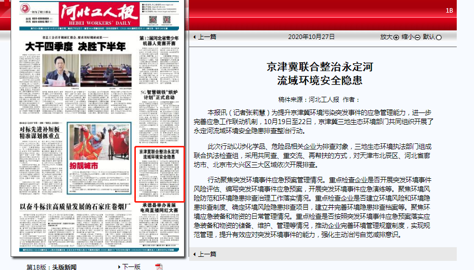 本报讯(记者张莉慧)为提升京津冀环境污染突发事件的应急管理能力,进一步完善应急工作联动机制,10月19日至22日,京津冀三地91直播部门共同组织开展了永定河流域环境安全隐患排查整治行动。