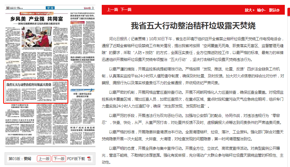 河北日报讯(记者贾楠)10月30日下午,省91直播厅组织召开全省禁止秸秆垃圾露天焚烧工作电视电话会,通报了近期全省秸秆垃圾禁烧工作有关情况,提出我省将按照“空间覆盖无死角、职责落实无盲区、监督管理无缝隙”的要求,采取“人防+技防”的方式,全面压实责任,全方位推进防控工作,以最严格的标准、最有力的举措迅速组织开展秸秆垃圾露天焚烧专项整治“五大行动”,坚决打击秸秆垃圾露天焚烧违法行为。