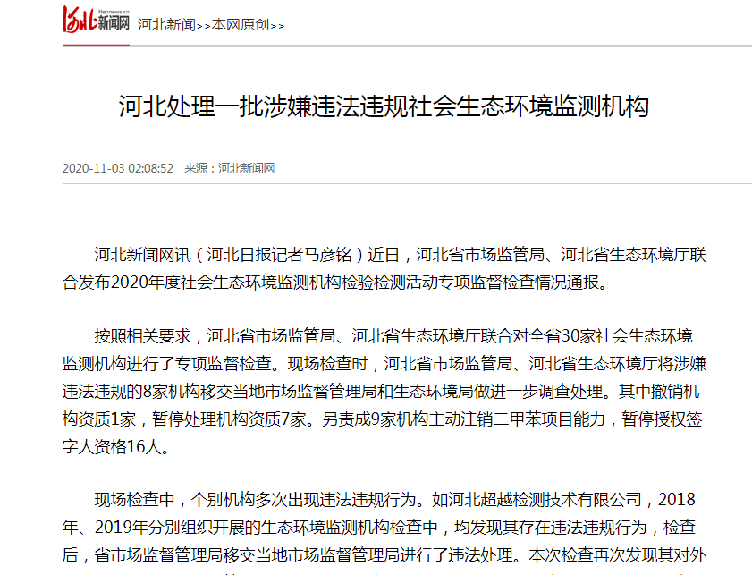 经研究,决定撤销张家口百信环境检测技术有限公司资质认定证书。各有关市市场监督管理局分别对河北超越检测技术有限公司、廊坊华测环境科技有限公司、河北卓恒环保科技有限公司、河北迈吉环保科技有限公司、河北合利环境检测服务有限公司、秦皇岛清宸环境检测技术有限公司6家机构作出“责令整改,整改期限不超过3个月。整改期间,检验检测机构不得向社会出具具有证明作用的检验检测数据、结果”的处罚决定。各91直播局应按照《加强社会91直播监测机构及其监测质量管理的暂行规定》,将多次违法、违规的河北超越检测技术有限公司列入“黑名单”,并由省91直播厅在监管平台予以公示。