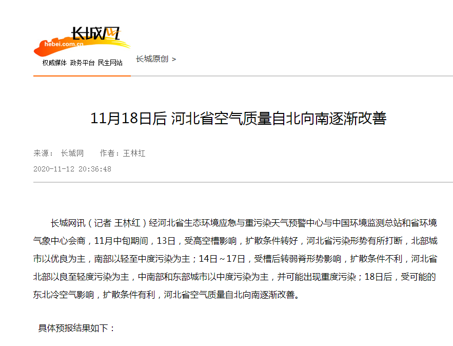 长城网 :11月18日后 河北省空气质量自北向南逐渐改善