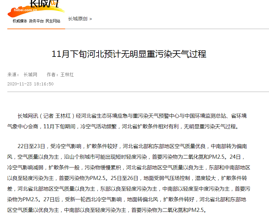 长城网讯(记者 王林红)经河北省91直播应急与重污染天气预警中心与中国环境监测总站、省环境气象中心会商,11月下旬期间,冷空气活动频繁,河北省扩散条件相对有利,无明显重污染天气过程。