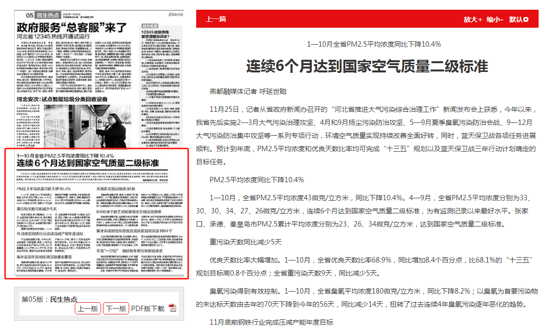 燕赵都市报: 1—10月全省PM2.5平均浓度同比下降10.4% 连续6个月达到国家空气质量二级标准