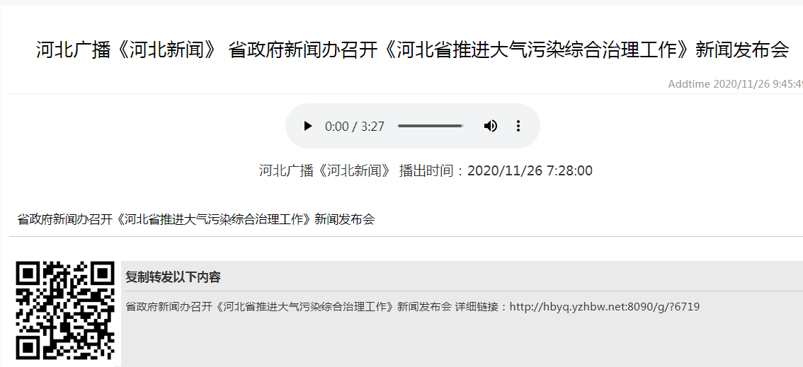 河北综合广播《河北新闻》:我省召开推进大气污染综合治理工作新闻发布会,今年秋冬季仍有重污染天气多发趋势。