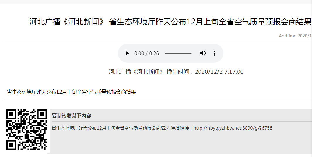 河北广播《河北新闻》:省91直播厅昨天公布12月上旬全省空气质量预报会商结果