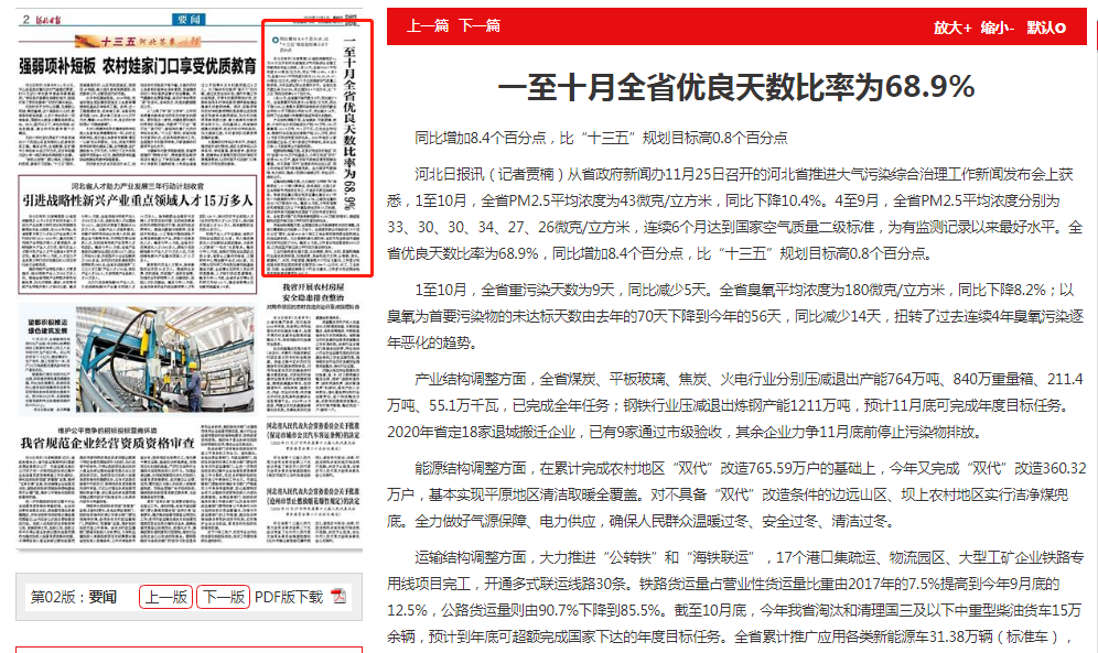 河北日报讯(记者贾楠)从省政府新闻办11月25日召开的河北省推进大气污染综合治理工作新闻发布会上获悉,1至10月,全省PM2.5平均浓度为43微克/立方米,同比下降10.4%。4至9月,全省PM2.5平均浓度分别为33、30、30、34、27、26微克/立方米,连续6个月达到国家空气质量二级标准,为有监测记录以来最好水平。全省优良天数比率为68.9%,同比增加8.4个百分点,比“十三五”规划目标高0.8个百分点。