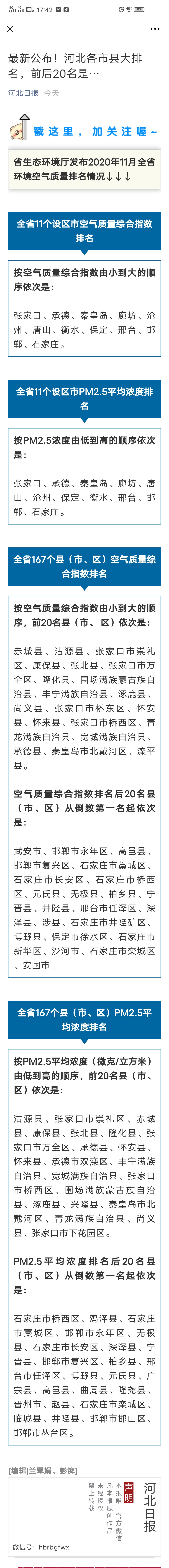 长城网:图解|河北省公布11月全省环境空气质量排名
