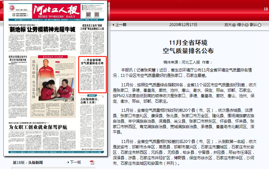 11月份,按照空气质量综合指数排名,全省11个设区市空气质量由好到差,依次是张家口、承德、秦皇岛、廊坊、沧州、唐山、衡水、保定、邢台、邯郸、石家庄。按PM2.5浓度由低到高的顺序依次是张家口、承德、秦皇岛、廊坊、唐山、沧州、保定、衡水、邢台、邯郸、石家庄。
