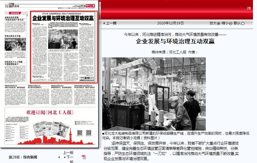 ■河北龙大包装制品有限公司新建的环保纸容器生产线,在提升生产效率的同时,也最大限度降低污染。本报记者胡小龙摄(资料图片)