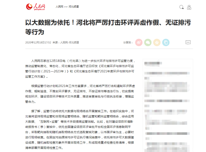 人民网:以大数据为依托!河北将严厉打击环评弄虚作假、无证排污等行为