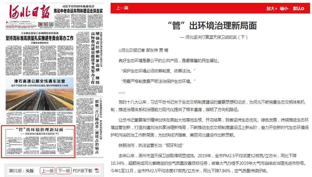 去年以来,涿州市蓝天保卫战取得明显成效。2019年,全市PM2.5平均浓度52微克/立方米,同比下降10.34%,超额完成河北省确定的空气质量改善目标任务,被省大气办授予2019年大气污染综合治理先进市称号。今年1至11月,全市PM2.5平均浓度47微克/立方米,同比下降7.84%,空气质量持续好转。