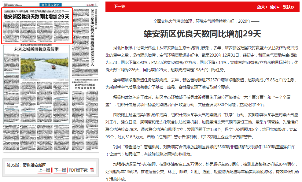 全年清洁取暖改造任务超额完成。去年,新区督导推进75257户清洁取暖改造,超额完成了5.85万户的任务,为采暖季空气质量改善奠定了基础,雄县、容城县实现了清洁取暖全覆盖。