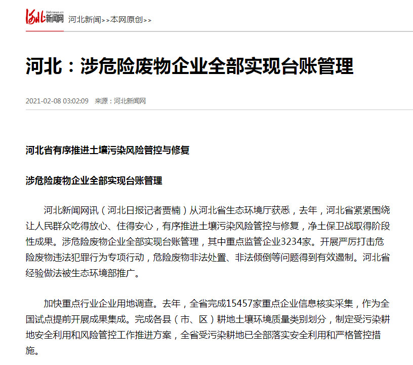 河北新闻网:河北省有序推进土壤污染风险管控与修复 涉危险废物企业全部实现台账管理