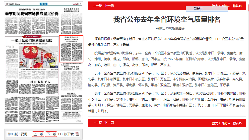 去年,全省空气质量相对较好的前20个县(市、区),依次是赤城县、康保县、张家口市崇礼区、沽源县、张北县、张家口市桥西区、张家口市桥东区、张家口市万全区、丰宁满族自治县、围场满族蒙古族自治县、尚义县、隆化县、怀安县、滦平县、涿鹿县、怀来县、承德市双滦区、承德市双桥区、张家口市宣化区、阳原县。