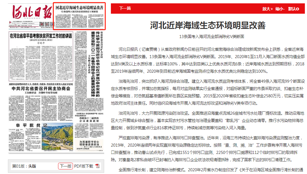 河北日报讯(记者贾楠)从省政府新闻办日前召开的河北省渤海综合治理成效新闻发布会上获悉,全省近岸海域91直播明显改善。13条国考入海河流全部消除劣V类断面。2019年、2020年1至11月入海口断面水质均值全部达到V类及以上水质标准,达标率100%,其中达到Ⅲ类以上优良水质河流6条;近岸海域水质达到预期目标,2018至2019年连续两年、2020年到目前近岸海域国考监测点位海水水质优良比例稳定达到100%。