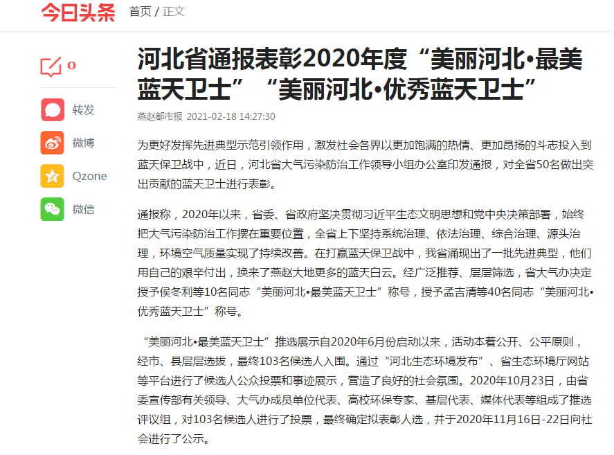 通报称,2020年以来,省委、省政府坚决贯彻习近平生态文明思想和党中央决策部署,始终把大气污染防治工作摆在重要位置,全省上下坚持系统治理、依法治理、综合治理、源头治理,环境空气质量实现了持续改善。在打赢蓝天保卫战中,我省涌现出了一批先进典型,他们用自己的艰辛付出,换来了燕赵大地更多的蓝天白云。经广泛推荐、层层筛选,省大气办决定授予侯冬利等10名同志“美丽河北•最美蓝天卫士”称号,授予孟吉清等40名同志“美丽河北•优秀蓝天卫士”称号。