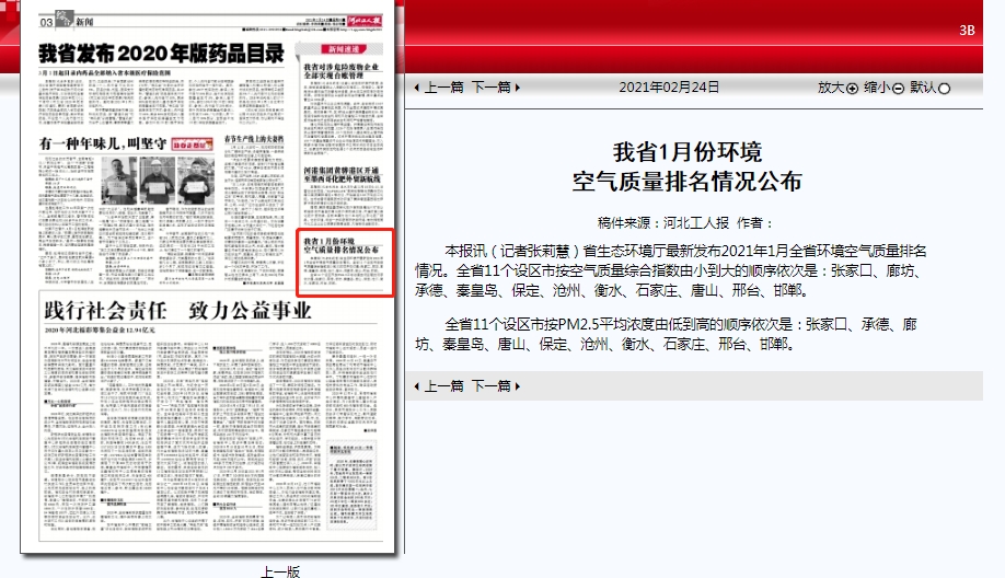 河北工人报:我省1月份环境空气质量排名情况公布 来源:河北省91直播宣传教育中心 时间:2021-02-24