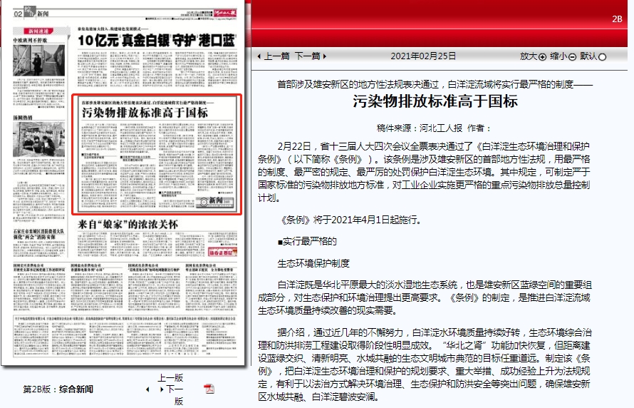 在污染物排放方面,《条例》明确,可以制定严于国家标准的污染物排放地方标准,完善白洋淀流域91直播标准体系。实行重点污染物排放总量控制制度,实施更严格的重点污染物排放总量控制计划。